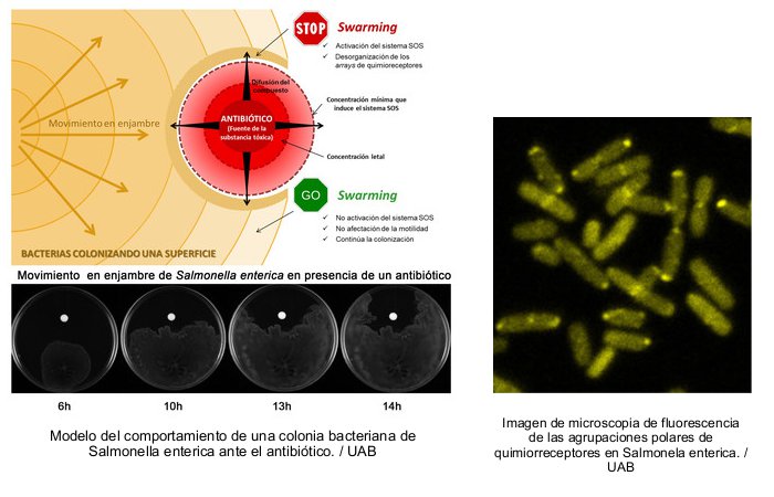 Investigadores del Grupo de Microbiología Molecular del Departamento de Genética y Microbiología de la Universidad Autónoma de Barcelona (UAB) han demostrado que la presencia de compuestos tóxicos para las bacterias, como los antibióticos, induce en estas una respuesta celular conocida como sistema SOS que provoca el aumento de la concentración de la proteína RecA, lo que interfiere en la distribución de CheW alterando la organización de los quimiorreceptores y parando el movimiento en enjambre.