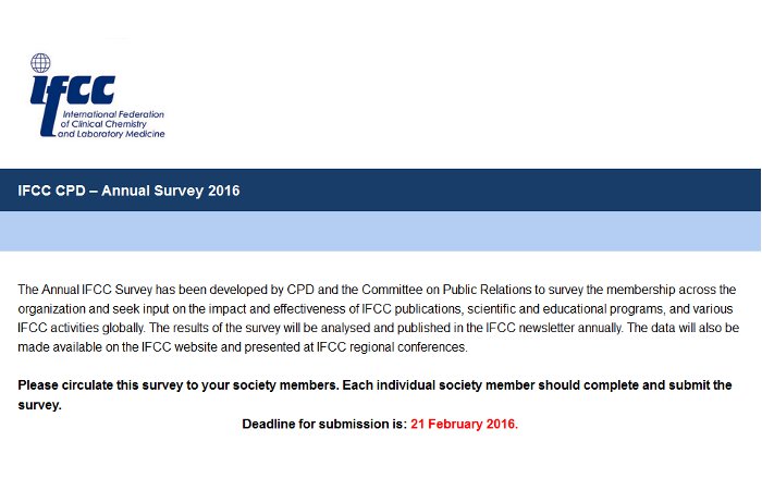 La Encuesta Anual de IFCC ha sido desarrollada por CPD y la Comisión de Relaciones Públicas para tomar conocimiento de la cantidad de miembros que tiene la organización y solicitar la opinión sobre el impacto y eficacia de las publicaciones, programas científicos, educativos y las distintas actividades a nivel mundial que realiza esta Federación Internacional.