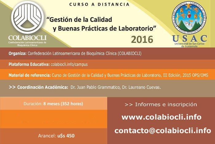 DESAFÍOS Y OPORTUNIDADES PARA OPTIMIZAR LA FASE PREANALITICA Y LA ELABORACIÓN DE INFORMES EN BIOQUÍMICA CLÍNICA Curso de la Asociación Bioquímica Argentina, comienza el 6 de abril 2026 y consta de 300 horas. https://aba-online.org.ar/preanalitica
