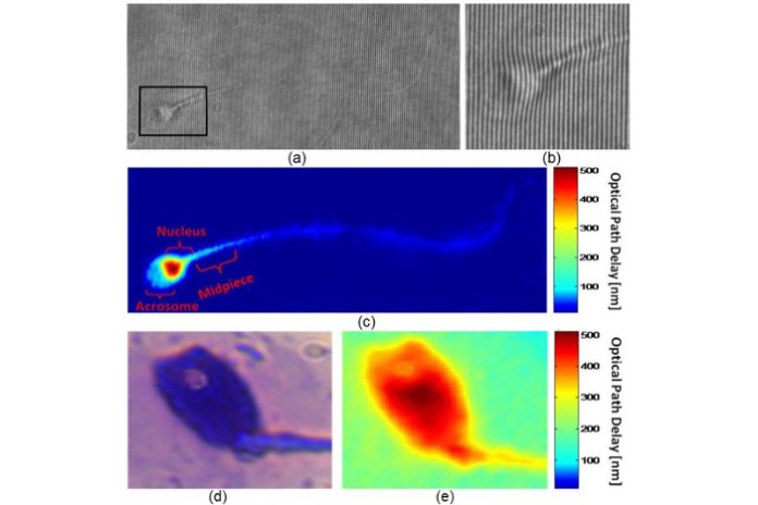 Imagen: (a) Un interferograma obtenido utilizando IPM. La muestra apenas se puede ver. Sin embargo, la información OPD se codifica en la curva de las franjas de interferencia, como puede verse a partir de la región ampliada de interés en (b). (c) El mapa OPD del mismo espermatozoide, tal como se calcula digitalmente desde el interferograma que se muestra en (a). Todas las principales características morfológicas de la célula son discernibles. (c,e) Imágenes de un espermatozoide con una vacuola acrosomal, usando: (d) BFM basada en etiquetas, y (e) la IPM sin etiqueta. La vacuola se ve claramente como un defecto en el mapa OPD de la imagen IPM. BFM = microscopía de campo claro; IPM = microscopía de fase interferométrica; OPD = retardo del trayecto óptico (Fotografía cortesía de Haifler M, Girshovitz P, et al., 2015, y Elsevier).