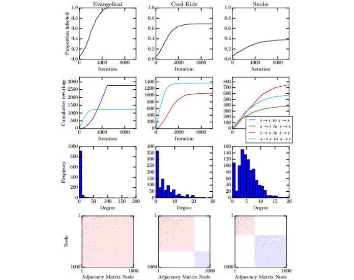 Pero no todos los benes se propagan de esta manera. El grupo de Santa Fe también ha identificado un patrón al que denominan la propagación de los ‘chicos cool’, en la que todos intentan conectarse a tantos individuos infectados como sea posible y con tan pocos individuos no infectados como sea posible. Esto representa un comportamiento asortativo en el que los individuos infectados buscan otros similares. Sin embargo, los individuos susceptibles también buscan a los infectados, que intentan rehuirles. El resultado es bastante distinto en este caso. “El resultado es una red compuesta por dos bloques: uno incluye a los susceptibles como ‘solteros’ desconectados, mientras el otro incluye a los individuos infectados e interconectados”, explica el grupo de Santa Fe. En otras palabras, este tipo de comportamiento da paso a grupos que acaban excluyendo a algunos individuos.
