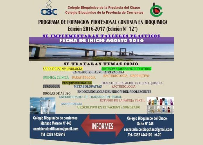 Inicia en Agosto de 2016. Organizado por el Colegio de Bioquímicos del Chaco y el Colegio de Bioquímicos de Corrientes.