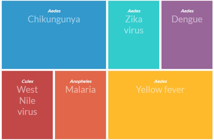 Mosquitoes are one of the deadliest animals in the world. Their ability to carry and spread disease to humans causes millions of deaths every year. In 2015 malaria alone caused 438 000 deaths. The worldwide incidence of dengue has risen 30-fold in the past 30 years, and more countries are reporting their first outbreaks of the disease. Zika, dengue, chikungunya, and yellow fever are all transmitted to humans by the Aedes aegypti mosquito. More than half of the world’s population live in areas where this mosquito species is present. Sustained mosquito control efforts are important to prevent outbreaks from these diseases. There are several different types of mosquitoes and some have the ability to carry many different diseases. Click below to see which diseases are transmitted by the Aedes, Culex, and Anopheles mosquitoes.