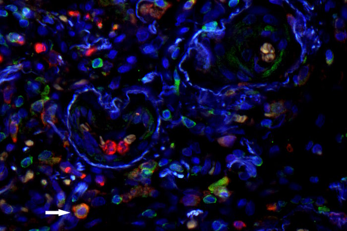 Staining of cells in lung tissue: the surface molecules CD11 and CD33 are shown in green and red, respectively. Nuclei are shown in blue. MDSC are positive for both surface markers and consequently appear orange (arrow). Source: Helmholtz Zentrum München