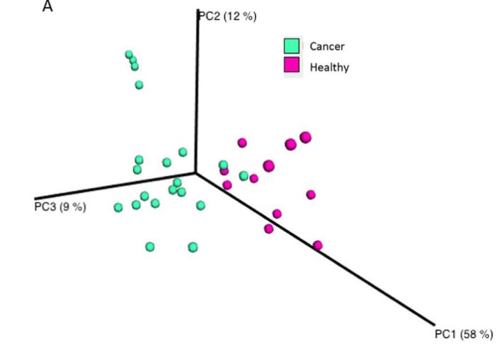The scientific team observed a clear difference in microbial inhabitants of the women with breast cancer compared to the women without. Using a UniFrac plot (see right), the researchers measured the similarity between samples and plotted it as a measure of distance from other samples. The samples from the women with cancer (green circles) and from the women without cancer (red circles) form separate clusters, showing a similarity within the group and differences from the other group.