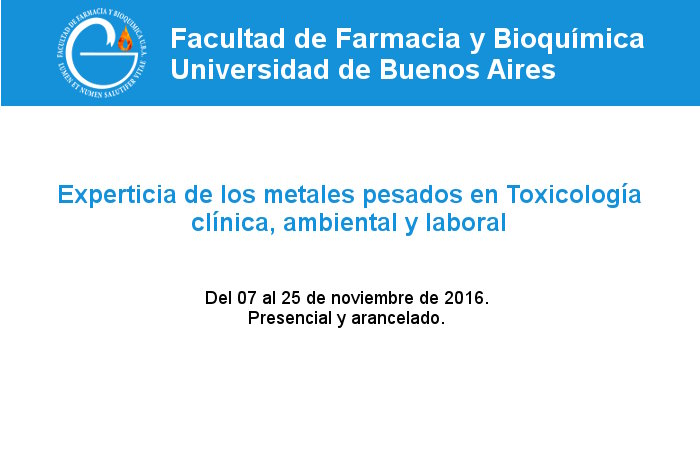REQUISITOS DE ADMISIÓN: Bioquímico o título equivalente otorgado por Universidades Nacionales o Privadas reconocidas. Se dará prioridad a aquellos profesionales procedentes de instituciones oficiales que se encuentren desarrollando actividades relacionadas con de la detección y cuantificación de metales pesados.