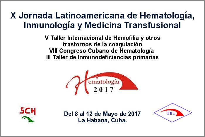 La Sociedad Cubana de Hematología y el Instituto de Hematología e Inmunología convocan a su evento HEMATOLOGÍA´2017, en el que se darán cita numerosos profesionales de América Latina y el Caribe en Hematología, Inmunología, y Medicina Transfusional, a fin de lograr un fructífero intercambio académico y científico del más alto nivel. También recibiremos, como ya es tradicional, delegados de todos los continentes, quienes comparten sus experiencias con nuestra región, y podrán visitar la expo comercial paralela al evento.