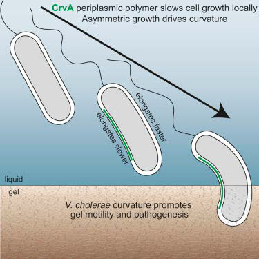 Los filamentos de CrvA se juntan en un lado de V. cholerae, formando un polímero duro que retrasa el crecimiento en ese lado de la célula. El otro lado de la bacteria crece más rápido, dando como resultado la forma curvada.