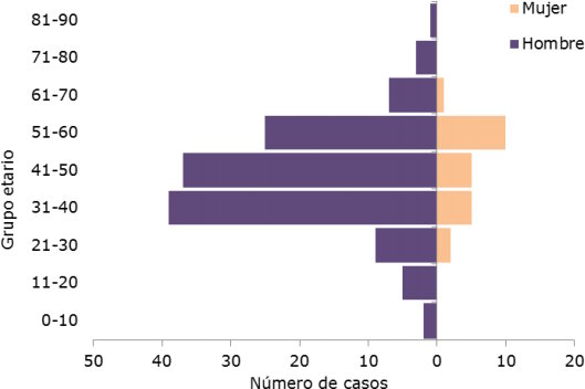 Los casos confirmados, se distribuyen en tres estados: Espirito Santo (13), Minas Gerais (134) y São Paulo (4) (ver Gráfico 1). El 50% de los casos confirmados corresponde a hombres de entre 31 y 50 años de edad (ver Gráfico 2). Con relación a las defunciones confirmadas, 48 ocurrieron en el estado de Minas Gerais, tres en el estado de São Paulo y tres en el estado de Espirito Santo.