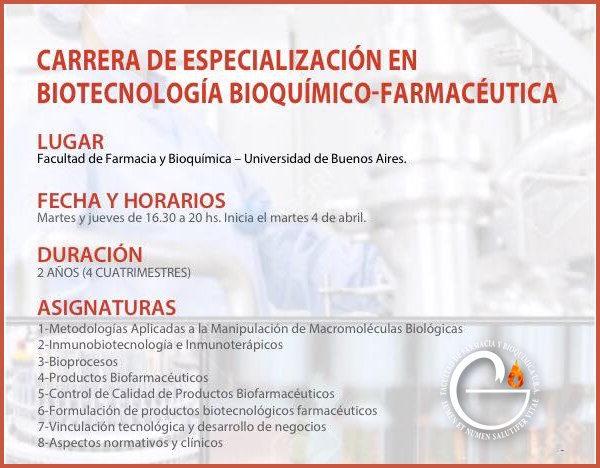 Esta nueva oferta académica de posgrado otorga el título de Especialista en Biotecnología Bioquímico Farmacéutica, teniendo una duración de 2 años.