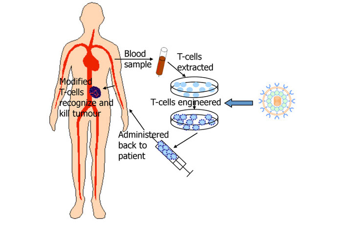 T cells are reengineered in a laboratory. The T cells are sent to a laboratory or a drug manufacturing facility where they are genetically engineered to produce chimeric antigen receptors (CARs) on their surface.