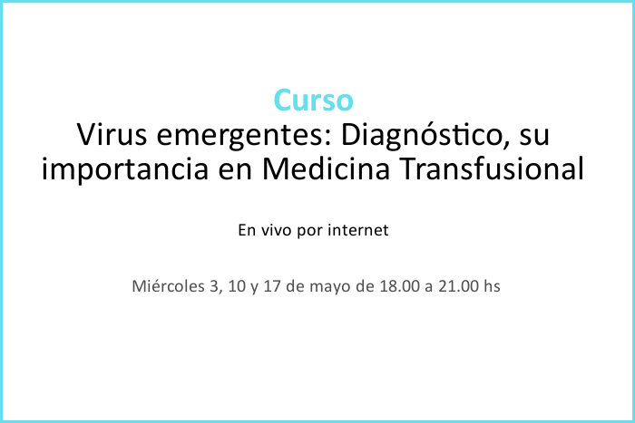 Descripción: En este curso se difundirá el conocimiento actualizado sobre virus emergentes, en cuanto a su diagnóstico y a la transmisión potencial de los mismos por transfusión de hemocomponentes.