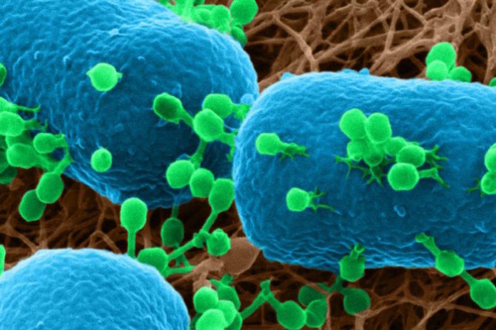 Bacteriophages (green) attached on E. coli bacteria (blue) on an agar substrate (brown), imaged with a helium ion microscope. Credit: Image courtesy of University of Jyväskylä
