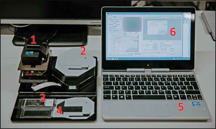 MoMic digital microscope scanner (1) with external motor unit attached (2). The microscope glass (3) is placed in the slide holder (4), which is placed in the microscope and navigated from the motor unit. The device is connected to and operated from a laptop computer (5) running software (6) for operation of the device.