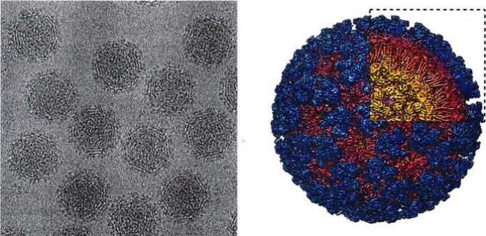Micrografía crioelectrónica de la cepa 12A del virus Mayaro (izquierda); y estructura tridimensional, con un corte en el primer cuadrante de la partícula (derecha).