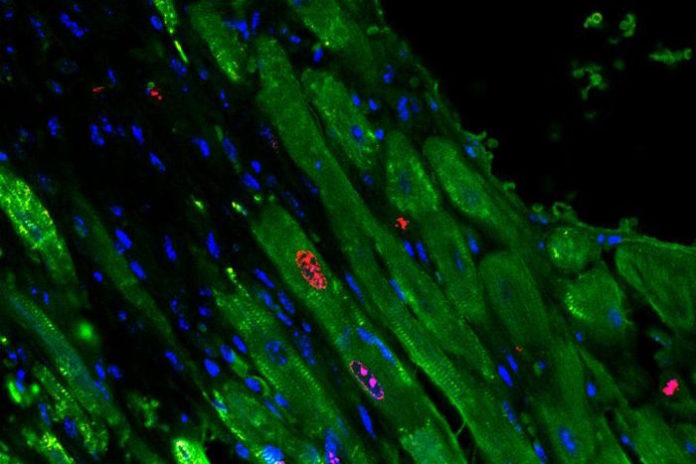 Cardiomiocitos proliferando tras la administración del gel que libera microARNs que promueven la regeneración del tejido cardiaco. Imagen: University of Pennsylvania.