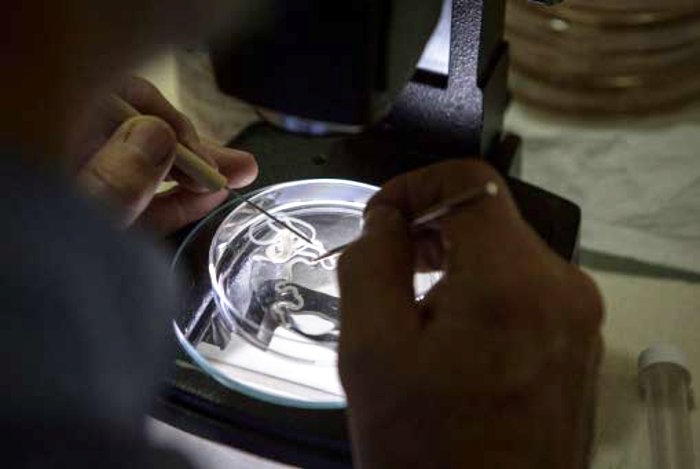 El Dr. Mark L. Eberhard, parasitólogo del Centro Carter, examina un gusano de Guinea en Bongor, Chad.