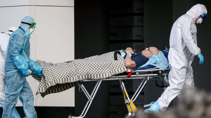MOSCOW, RUSSIA - APRIL 4, 2020: Medical workers in protective suits carry a man on a stretcher inside the Novomoskovsky multipurpose medical center for patients suspected of the COVID-19 coronavirus infection. Vyacheslav Prokofyev/TASS (Photo by Vyacheslav ProkofyevTASS via Getty Images)