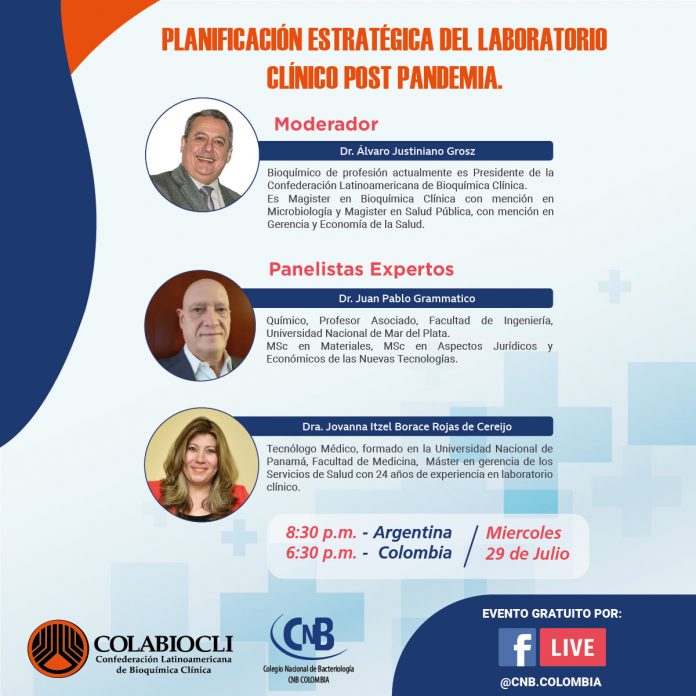 El miércoles 29 de julio de 2020 se realizará el Conversatorio: “PLANIFICACIÓN ESTRATÉGICA DEL LABORATORIO CLÍNICO POST PANDEMIA”