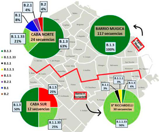 Mapa 1. El análisis de las secuencias de los genomas de SARS-CoV-2 obtenidos en la Ciudad Autónoma de Buenos Aires mostró que en la zona Norte prevaleció el linaje B1.3, único linaje detectado en el Barrio Mugica, mientras que en la zona sur fue el B1.1.33.