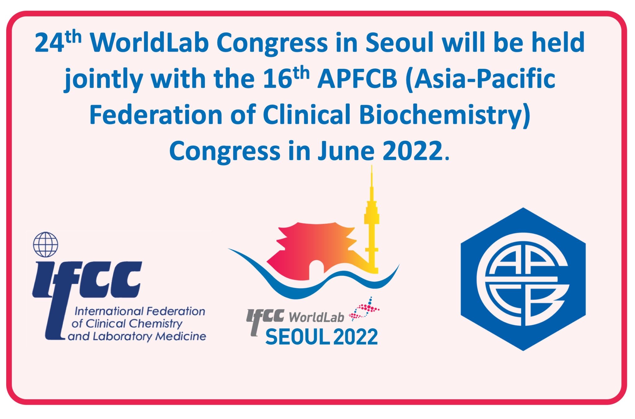 We are pleased to inform you that the 24th WorldLab Congress in Seoul will be held jointly with the 16th APFCB (Asia-Pacific Federation of Clinical Biochemistry) Congress in June 2022.