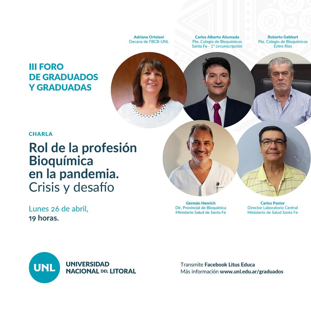 La Charla “Rol de la Profesión Bioquímica en la pandemia. Crisis y desafío”, en el marco del III Foro de Graduados y Graduadas de la UNL, se llevará adelante el próximo lunes 26 de abril a las 19hs.