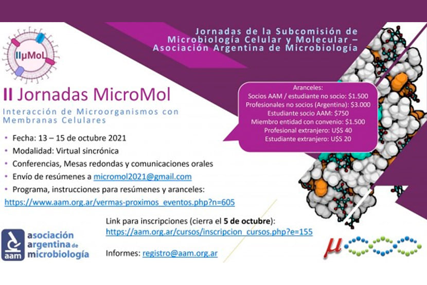 Presentación de resúmenes: Encuentre el reglamento para descargar aquí. Se aceptarán resúmenes por mail (micromol2021@gmail.com) para e-posters ó comunicaciones orales hasta el 17 de septiembre.